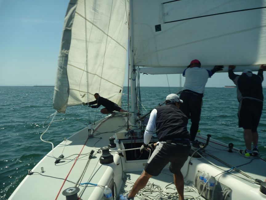 37フィートでブームを押してバックさせるのは大変ですが、これが当たり前に出来ないとプレスタートでスターボード固めになりレースが終わってしまいます。