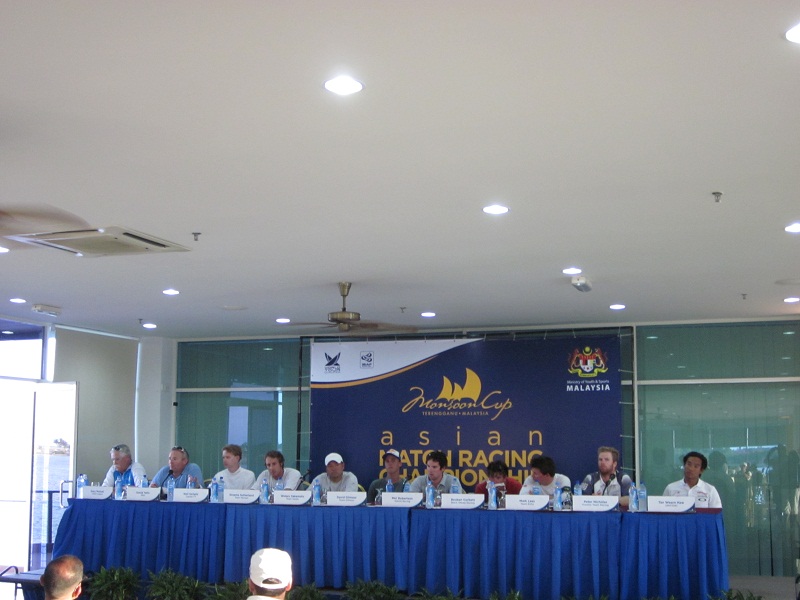 レース後のプレスカンファレンス。白い帽子が筆者です。回りは22歳前後の若いセーラーばかりです。