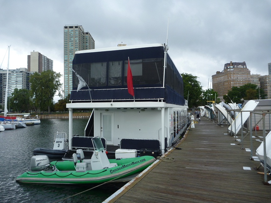 レースの際は沖にでて観戦ができます。トイレ、ロッカー、バーカウンターを備えており快適そうです。普段は2階にスピンなどセールが干してあります。